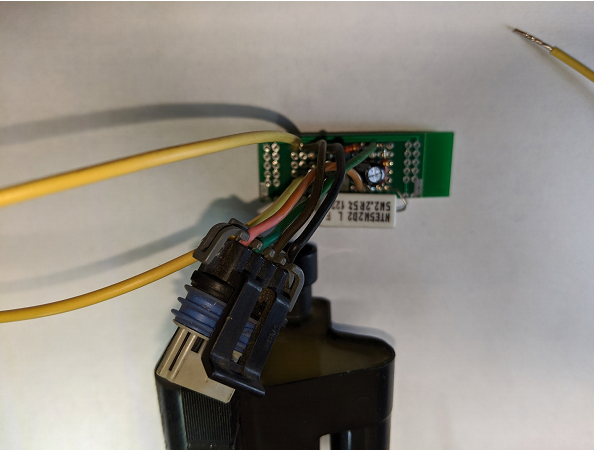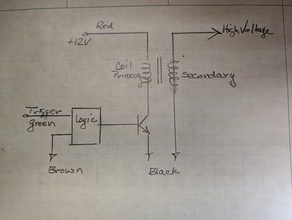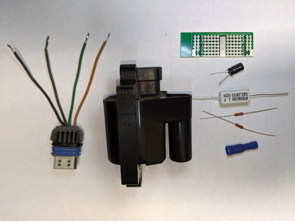The components I used are shown in Figure 4. If your coil doesn’t have a connector plug you can cut some plastic back and get to the pins. If you orient the coil as I have, the pins left to right will be red, green, brown, black. The blue tube is a 14-16-gauge butt connector, it slides on to the coil’s high voltage pin very nicely.