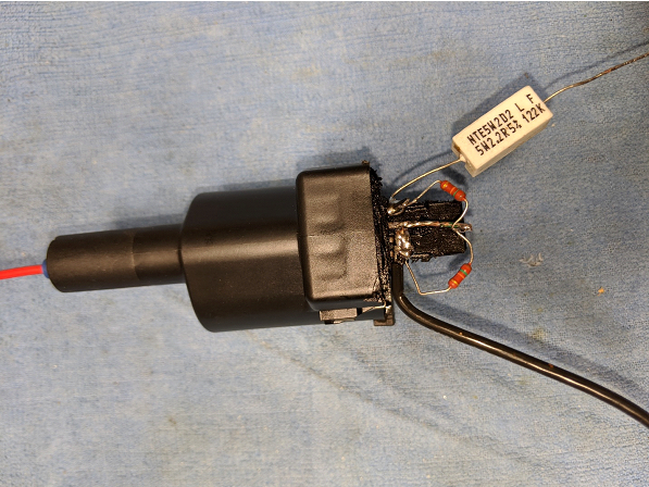 Although the four components can be soldered and left hanging on the coil wires, I like to use a small prototype or vector board to make things more ridged and easier to secure in the box. Figure 5 is the assembly with the plug, ready to go in the box.