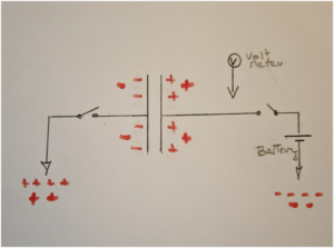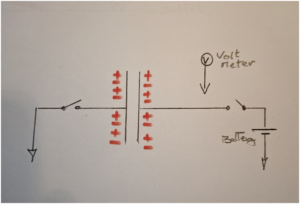 So, for every positive charge that is accumulated on the right plate a positive charge departed the left plate, the condenser as a whole is still electrically neutral. It still has the same total number of positive charges; however, some are not where they would like to be. Like the water tank, on a larger scale, the whole world is still neutral as the battery took those extra charges that are on the right plate from ground on the right while those missing on the left plate can be found at ground on the left. The device has not condensed charge, it is still neutral, therefore for the rest of this paper we will call them by their correct name, capacitor. With the capacitor charged, if we open the right switch the voltmeter will read a voltage. If we increase the stored charge by pushing more current in, the capacitor voltage will increase. In a similar manner, if we have the same number of charges on a smaller capacitor the voltage will be higher. In either case, a very important point is that the capacitor is storing energy that we could do something with. For example, we could attach a small LED bulb to the capacitor and close the right and left switch, we would see a flash as the capacitor discharged, dumping its stored energy into the bulb. In a more notable example, I received some capacitors from Lighting Magneto for evaluation. The last test was a 600V leakage test, after which the units were placed on the bench. After more than 15 minutes, during cleanup, the first capacitor was accidently picked up by its leads – wow, it had 600 volts worth of stored energy still onboard. Like the water tank, for a charge to leave one side of a capacitor another charge must enter the other side. Had I picked that capacitor up by one lead only, the experience would have been a lot less painful.