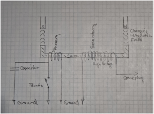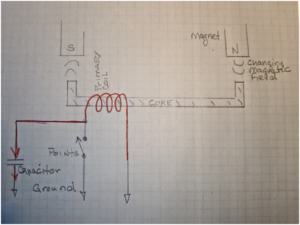 A quick summary of the purpose of each component in Figure 2 might be helpful. The primary coil’s job is to store up as much energy as possible during the time the magnetic field is changing and the points are closed. Its second job is to transfer that energy to the secondary coil by transformer action when the points open. The point’s function is to short the primary coil so it can maximize its current and thus maximize its energy collection. The points also precisely time when the spark occurs at the sparkplug. The secondary coil’s job is, by transformer action, to accept energy from the primary coil at such a high voltage that a spark at the sparkplug occurs dissipating all the energy.