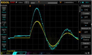 Figure 18. Sparkplug voltage in yellow (2kV/box), capacitor voltage in blue (50V/box), after an EK mag trip (0.22µF, 0.020 plug gap).