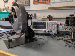 After getting the Clinton back up and running it seemed that an experiment involving capacitor value was in order. A real test might be to up size and down size the standard 0.2µF capacitor 2X, but 3X or 4X would really make a point. In addition, a 1949 Chevy going 5000 miles prior to changing the points and condenser would have mechanically bounced down gravel roads and open and closed the points more than 40 million times. That capacitor might be a fair test also. In the end, the original in each magneto (generally about 0.22µF), a 0.06µF, a 0.78µF and a 1949 Chevy capacitor were compared. The magnetos tested were a Maytag on a testbed, Figure 14, a Wico EK on a testbed, Figure 15, a running Clinton seen in Figure 1, a Wico EK running on an Hercules, Figure 16, a Wico Series A running on a 3 horsepower John Deere EP Northern, Figure 17 and a Fairbanks Morse RV-2B. This resulted in data on all three types of changing magnetic fields mentioned earlier. There are several questions to be answered:  would some or all of those capacitor combinations start and run an engine smoothly and do so without excessive arcing across the points which would lead to pitting. There are several parameters specified on capacitors but unless you dig deeply most will be specified by only two parameters, capacitance value and operating voltage, so determining the maximum voltage on each capacitor would be helpful also. Model T buzz coils are electrically very noisy with high frequency noise spikes so another capacitor specification, maximum rate of voltage change, must be watched for them. Although buzz coils use the same schematic as Figure 2, they are not addressed in this paper. Yes, buzz coils and all pre-electronic ignition automobiles use the Figure 2 schematic. Rather than using a changing magnetic field to create the current in the primary coil they use a battery.
