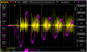 Figure 13 demonstrates the transformer action when a Wico EK is tripped. In order to keep the high voltage in the range of the oscilloscope the coil and capacitor voltage were purposely lowered by increasing the capacitor to 33µF. The yellow trace is the capacitor/primary coil voltage displayed at 20V per vertical box and peaks at 60V. The blue trace is the open circuit (no sparkplug) output voltage of the high voltage coil displayed at 500V per vertical box, peaking at 2640V. The voltage multiplication is 44, very close to the turns ratio of 43. The error here is probably in reading the scope voltages or my counting the 8400 secondary turns.