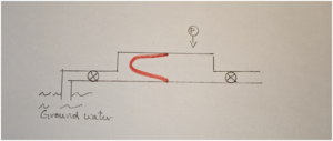If we open the right and left valves and pump another 3 gallons in, 3 gallons will leave the left side as the diaphragm stretches more. Closing the right valve, we would now read a higher pressure. We might note that at this point the ground water on the left has an excess of 6 gallons while the ground water on the right is reduced by the same amount. If we set up the same experiment with a drum of the same length but with a smaller diameter, the extra 6 gallons will have stretched the membrane much more and we would read a much higher pressure.