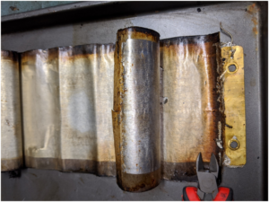 In Figure 7, I have partially unrolled a typical early 1900’s condenser. On the left you see a layer of waxed material and under that the upper plate. Mid picture I have pulled up the upper plate to reveal the lower plate. The brass plate is the contact to one of the aluminum sheets.