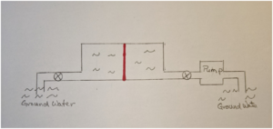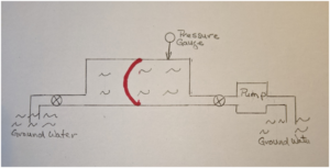 With the left valve closed, we open the right valve and attempt to pump 3 gallon in. Nothing happens. In order to push water into the right side the membrane would need to stretch leftward to make room, but it can’t because the left side is full. Now let’s open the left valve and pump 3 gallons in the right side. The membrane stretches leftward and pushes exactly 3 gallon out the left side. We have put 3 gallon in but the drum is still 50 gallons. If we now close the right valve, we will read a pressure on the pressure gauge as the membrane tries to return to its neural position, Figure 5.