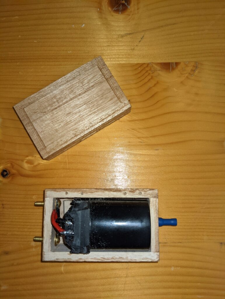 Figure 6 is the system in the box, ready to glue the lid on. The thumb nut attached to the red wire can be painted red and the nut attached to the black wire painted black. Unlike a buzz coil, Evac2 is polarity sensitive so the red wire and the black wire must be identifiable externally.