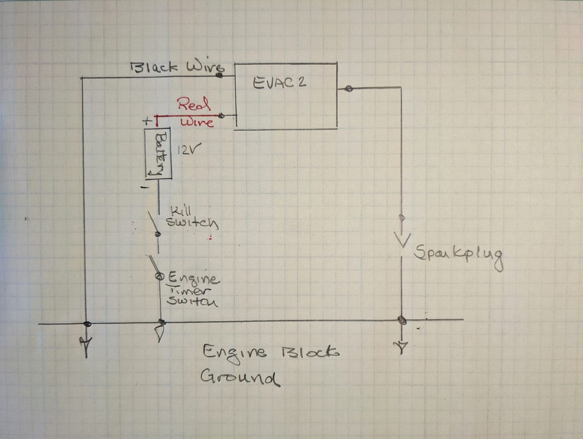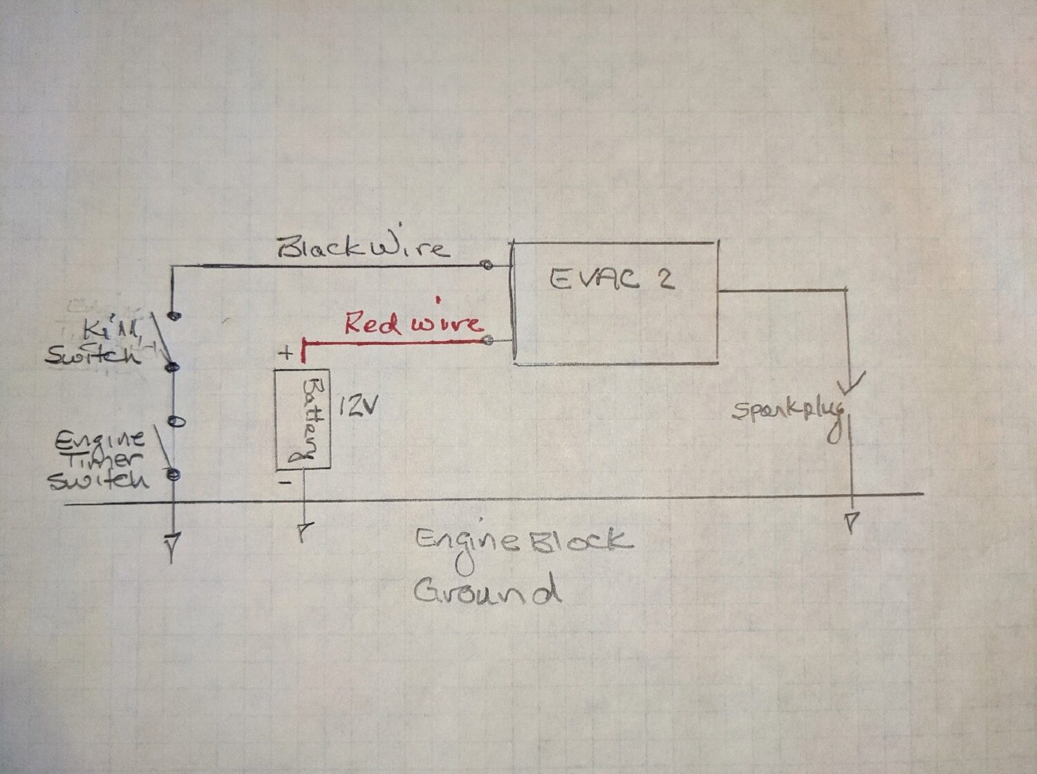 Now that the buzz coil replacement is completed it needs to be connected to the engine. Figure 7 is a common connection schematic. The red Evac 2 wire goes to the 12V battery +, the black Evac wire goes to the kill switch, the other side of the kill switch goes to the engine timer switch, the high voltage output wire goes to the sparkplug. The other side of the timer switch, the battery – terminal and the sparkplug must all be attached to the engine block which is ground. Figure 8 is another connection just as valid as Figure 7. In Figure 8 the red wire goes to the battery + terminal, the black wire goes to ground (engine block), the battery – goes to the kill switch. A third connection would be to put the engine timer switch where it is in Figure 7 or Figure 8 but put the kill switch as in the opposite Figure.