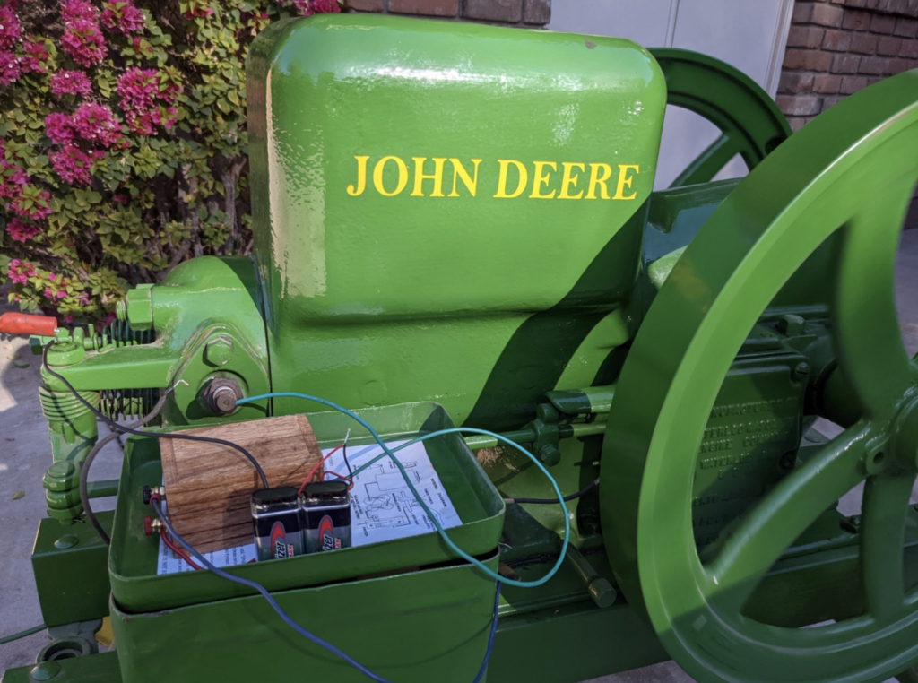 The buzz coil replacement is very efficient and effective. Upon firing, it puts itself to sleep waiting for its next signal thus saving battery power. If an engine happens to stop with the timer switch closed Evac2 will not run the battery down. The spark is very strong, typically able to throw a two-inch arc. Cars that use the UF 262 coil set sparkplug gaps in the region of 0.50”, although not necessary the engine plug gap could be expanded to 0.050. It is shown using a 12V battery, it also works fine at 18V, it will not work on less than 11V. Typical buzz coils measure 2X3 ½ X6 inches. Evac2 shown in Figure 6 is in a box measuring 2X2X3 ½ inches, 1/3 the volume of a buzz coil. Rie Fulk built a 1/3 scale John Deere sparkplug engine. Needless to say, the battery box on that engine is very small. A goal was to get a small Evac2 like that shown in Figure 6 plus a battery in his battery box. Figure 9 is Evac2 running a John Deere 3 hp sparkplug engine using two 9V batteries connected in series (18V). Those tiny 0.5 Amp hour 9V batteries ran the engine for a bit over two hours. Not visible in Figure 9 is a capacitor across the batteries for reducing output impedance.