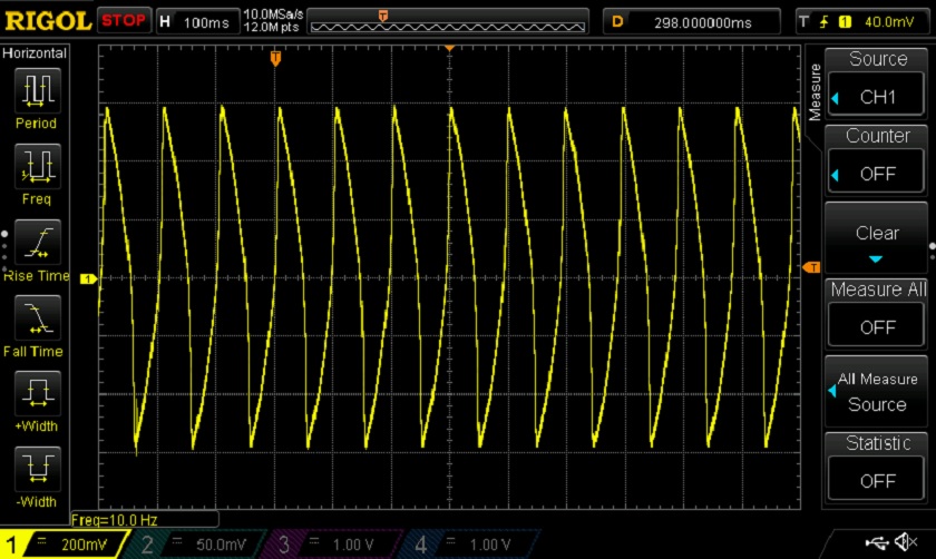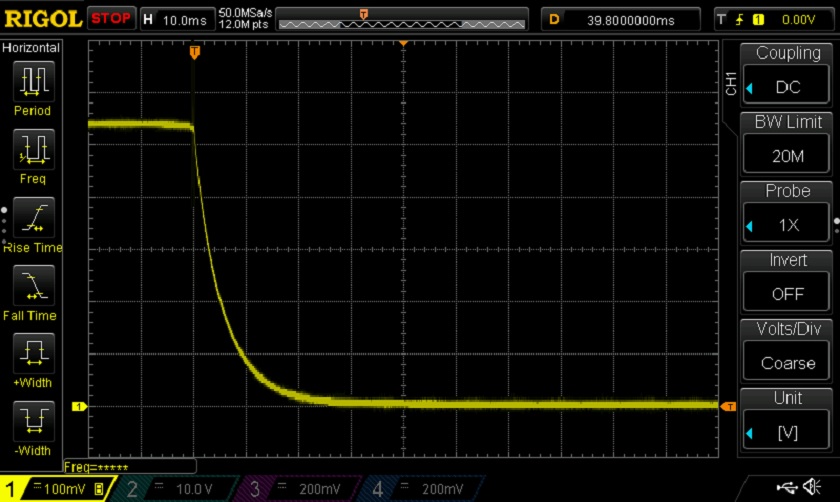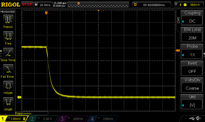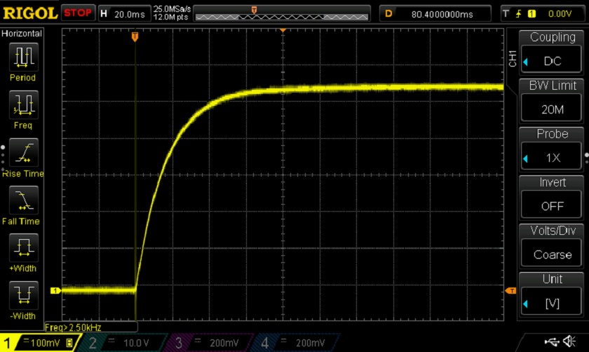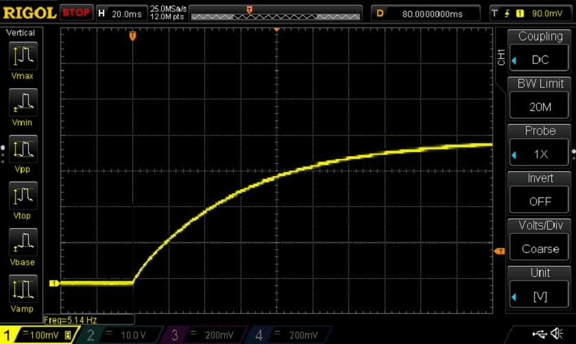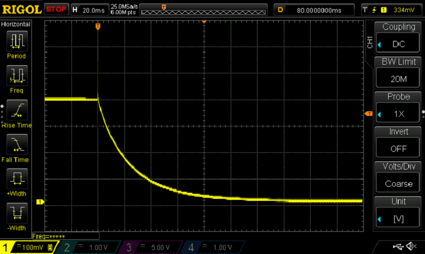Here in Figure 1-4 the time scale left to right is 0.050 Second ( 50ms) per box. At about 100ms from the left 6 Volts was applied to the coil (blue trace). At that point the current begins to rise with the yellow vertical scale being 0.2A per box. From application of the 6V, 1 box (50ms) later the current has risen a little over 2 boxes (0.4A). Finally, after about 4 boxes of time (200ms) the current has risen about 4 boxes (0.8A).