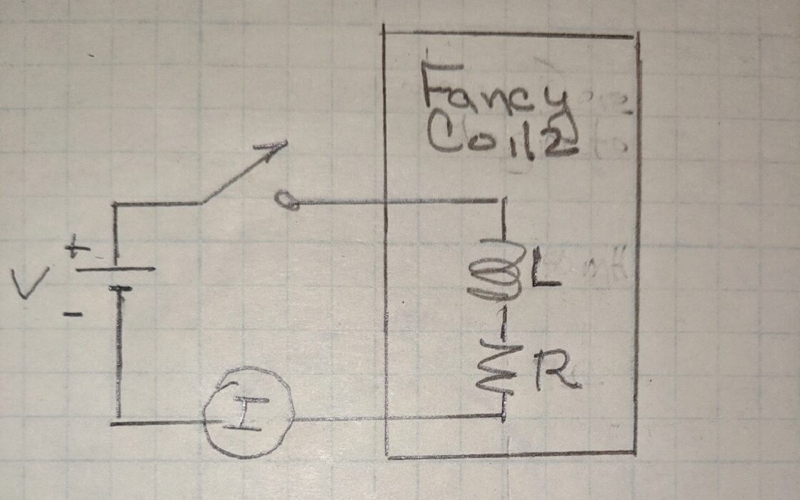 Unlike the flywheel if you apply a voltage (force) to a resistor, the current, I (Amps), will instantly jump to its final value of the voltage (V) divided by the resistance (R). Ohm’s law says I=V/R. That’s the first equation. An inductor (coil) is not like the resistor but is very similar to the flywheel. When voltage is applied to a coil (similar to the force on a flywheel) the current does not immediately jump to its final value. Rather it starts at zero and ramps up toward its final value just like the flywheel starts at zero RPM and ramps up. The coil current ramp rate is a very well-defined exponential based on physical properties. The final value, once it gets there, will be the voltage divided by the coil resistance, V/R. But, again, it takes time for it to get to the final value. Figure 1-3 schematically demonstrates how to measure the current rise time of a coil, in this case, Fancy Coil2. In that schematic the I symbol represents the oscilloscope being used as a current meter. Figure 1-4 shows that it took about 200 ms (0.200 s) for the current to reach close to its final value of 0.8 A.