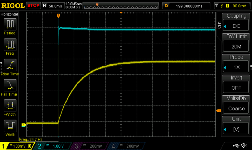 Figure 1-4 – Current rise Time of Fancy Coil2. Yellow Vertical Scale 0.2A/box, Blue Vertical Scale 1V/Box, Horizontal 50ms/Box (0.050S/box).