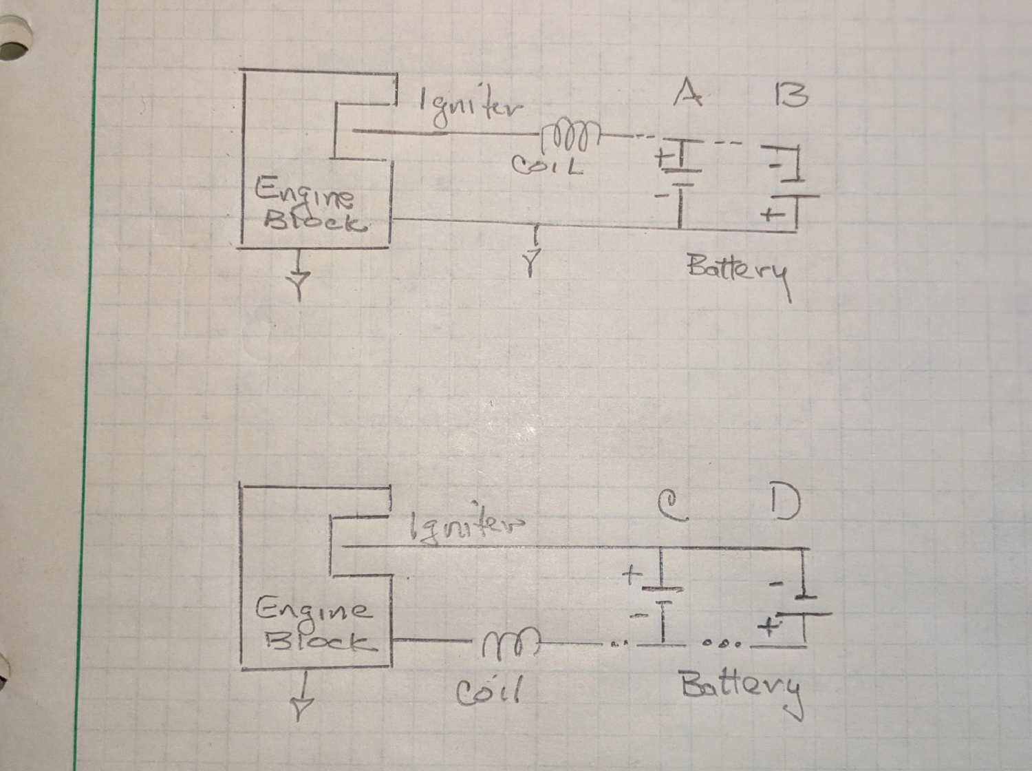 You may have been given instructions on the correct way to connect a battery and coil to the igniter. If you prefer your electrons to flow left to right across the igniter points as opposed to right to left then there is indeed a correct way to make the connection. Recently the same engine was run in the four configurations of Figure 1-7. In the first two configurations the coil is between the igniter fixed point (nongrounded side/ terminal) and the battery, A and B reverse the battery (electrons left to right or right to left). In the second two configurations the coil is in the ground leg of the circuit, C and D reverse the battery. All four configurations ran the engine very smoothly. Personally, I prefer A (and is likely the one you’ve been told is correct) but it is a simple series circuit and the order of the component makes no difference.
