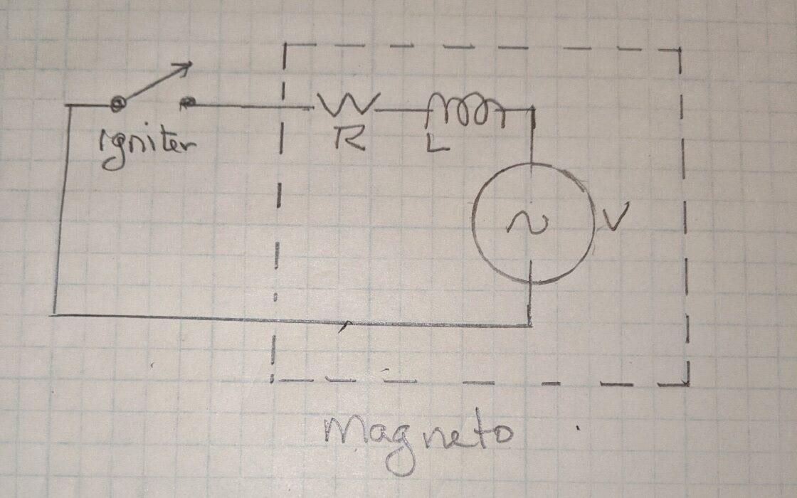 In the first part of this article, three circuit elements were used to create a spark: battery, coil and igniter. In the low-tension rotary magneto, the rotating coil performs two of those functions, the battery and the coil. Figure 2-2 shows schematically the magneto and igniter; an internal generator creating a voltage, the coil, L, and its internal resistance, R, connected to the igniter. Moving the coil in the magnetic field causes it to become a generator which causes current to build up inside itself when the igniter points are closed. That current inside itself then creates the magnetic field around itself which stores the energy for the spark as discussed in Section 1. So basically, the rotary low-tension magneto is just a mechanized battery and coil system where moving the coil replaces the battery. All those things discussed in Section 1 will still be true: the energy stored in the coil becomes the energy of the spark, the energy increases as I2 (get your current up) and the current takes time to go from zero to its final value.