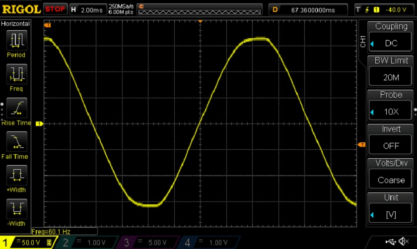 Figure 2-6 Wall socket sinusoidal wave form. Vertical scale 50V per box