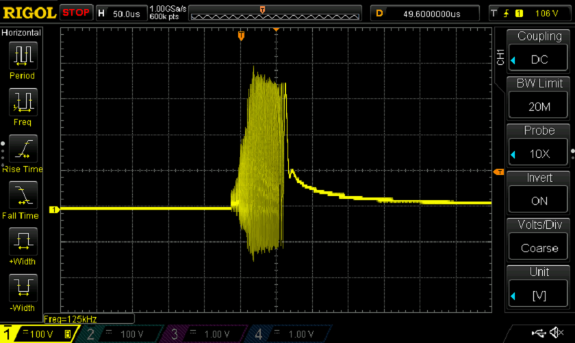 Figure 2-7 Voltage at Magneto when Igniter trips. Vertical scale 100V/box, horizontal 50uS/box